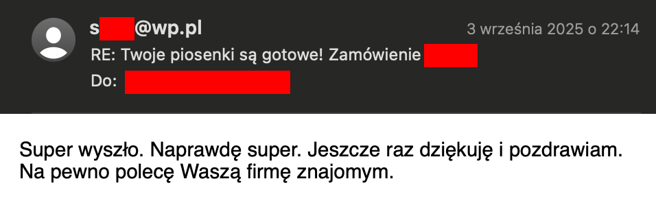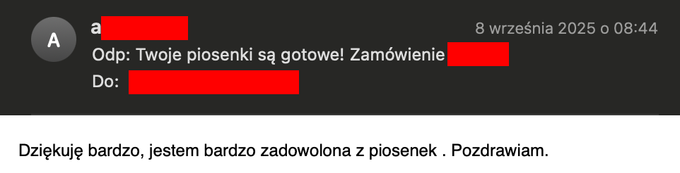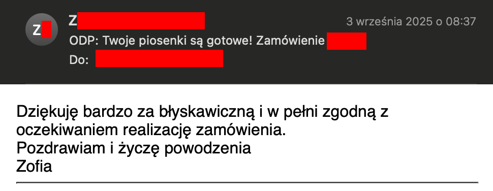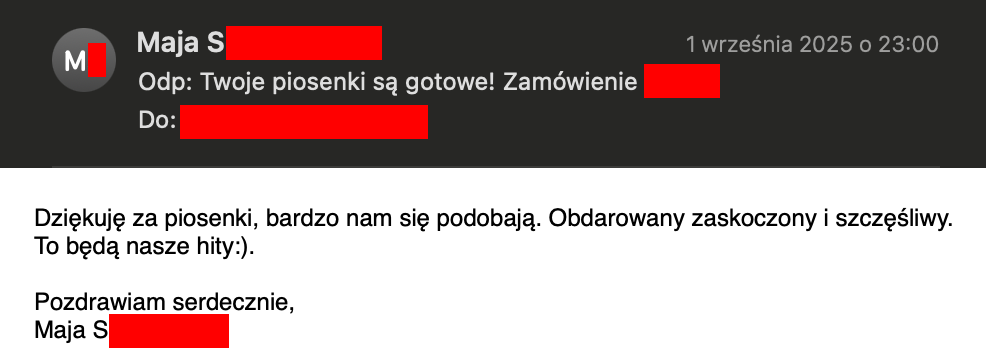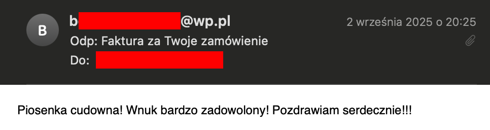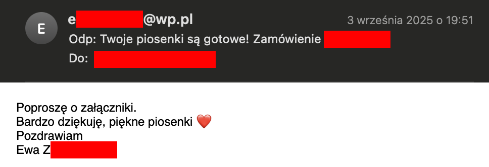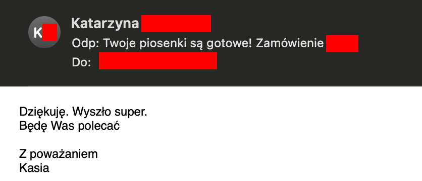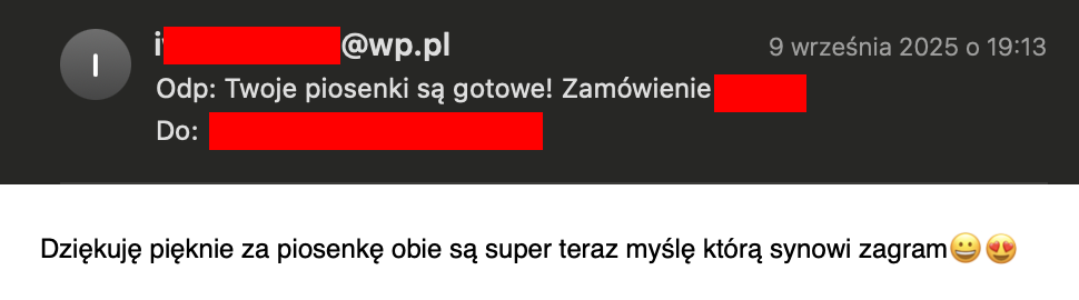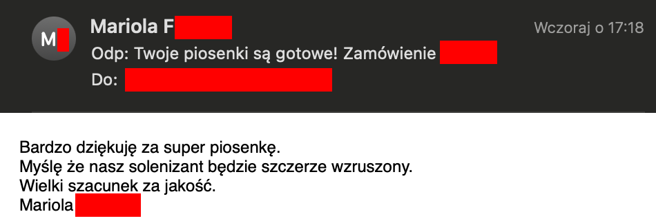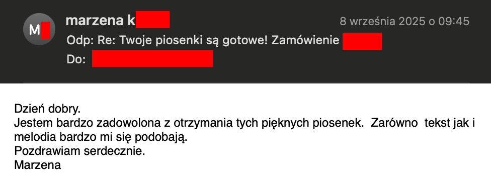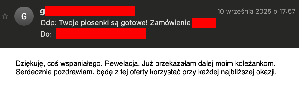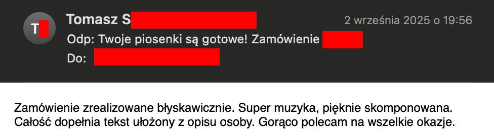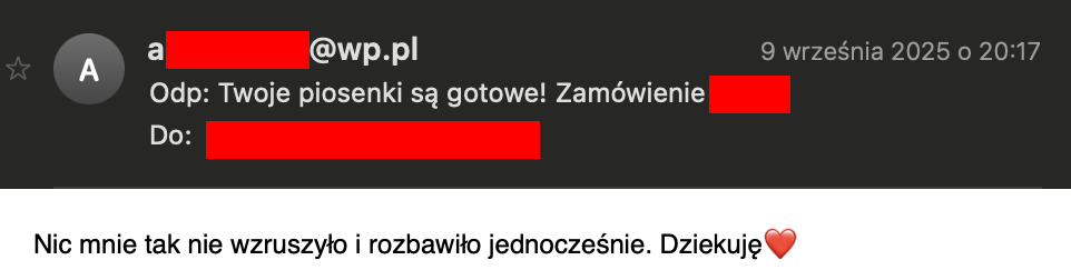 Każda piosenka tworzona jest indywidualnie, na podstawie historii i okazji, dzięki czemu trafia prosto do serca i wzrusza obdarowaną osobę.
